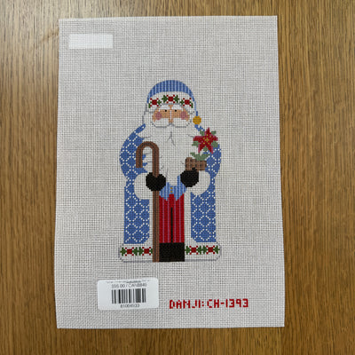 Father Christmas Blue Holding Staff and Poinsettia