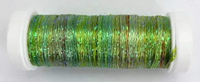 Shimmer Floss is a braided combination of rayon and metallic fibers approximately 1/8" wide. It can be laid flat or simply stitched. Use as a single thread in lengths of 24" or less. 10m spool